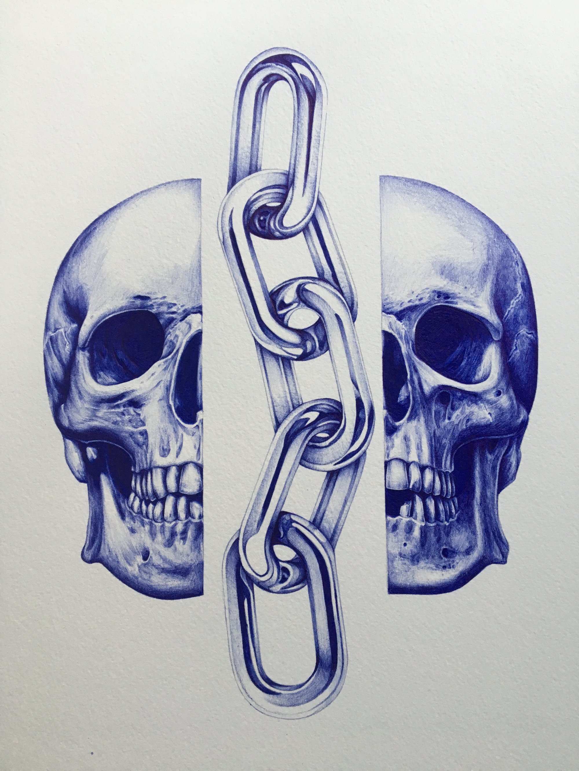 Skull and chains - ballpoint pen. Giclee archival print on A3 310gsm textured watercolour paper by Hahnemuhle. Individually signed